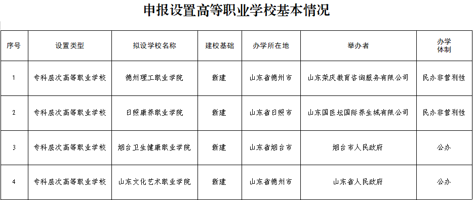 根據(jù)《中華人民共和國高等教育法》《中華人民共和國職業(yè)教育法》《中華人民共和國民辦教育促進法》《山東省高等職業(yè)學校設置暫行辦法》等法律法規(guī)和有關政策規(guī)定,經(jīng)省高等學校設置評議委員會專家考察和會議評議,現(xiàn)對申報設置的4所高等職業(yè)學校予以公示。公示期為2024年4月7日至2024年4月11日。